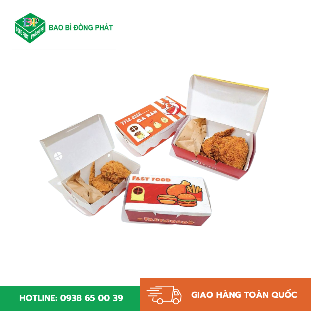 Bao Bì Giấy Đồng Phát nhận in hộp giấy đựng gà rán theo yêu cầu với đầy đủ các dịch vụ từ tư vấn, thiết kế đến sản xuất. Khách hàng có thể yêu cầu in logo, slogan, thông tin liên hệ, mã QR hoặc thiết kế riêng theo phong cách thương hiệu.